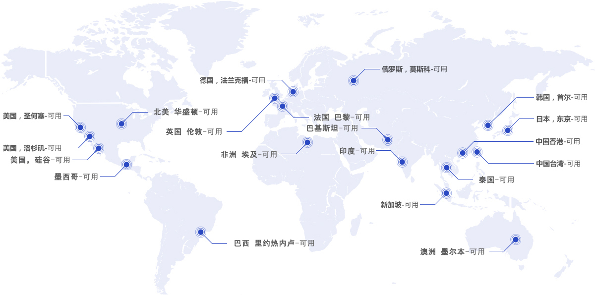 海外IDC在亚洲、北美、南美、欧洲和中东均有分布,连接全球主流运营商骨干网和区域运营商网络,轻松实现全球业务覆盖